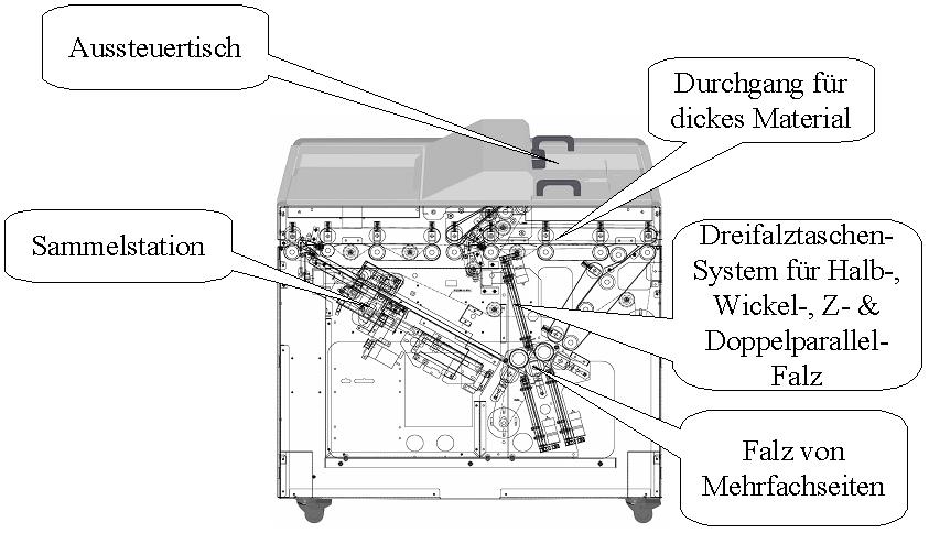 Die FA 4000 faltet von 1-10 Blatt 80 g/qm; Qualität. Sie besteht nicht nur aus dem reinen Falzmodul, sondern hat ein Aussteuerfach für unvollständige Sätze, ein Sammelfach für Mehrfachblätter vor dem Falzen und eine Übergabeeinheit für "nicht-zu-falzendes" Material.